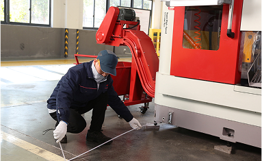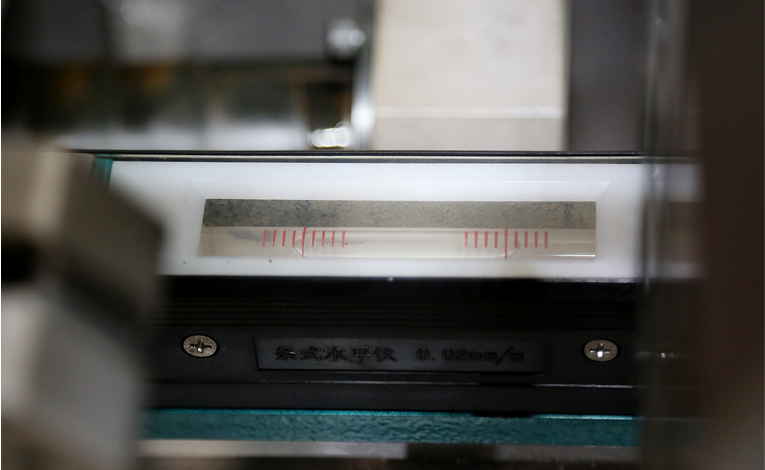 - 左右水平調(diào)整:將水平儀放置在切割線軌上,通過擰動床身前側(cè)左右兩側(cè)底部的螺栓來調(diào)整機床床身的左右水平。調(diào)整過程中,密切觀察水平儀,直至氣泡位于水平儀的正中央,此時達到左右水平狀態(tài),隨即擰緊螺栓固定。
